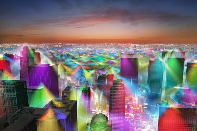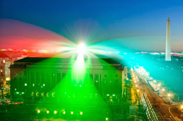 Министерството на търговията, което е със седалище във Вашингтон. Картината се фокусира върху радиацията, която се излъчва от една единствена клетка телефон кула. Различните цветове представляват различни честоти радиацията .
