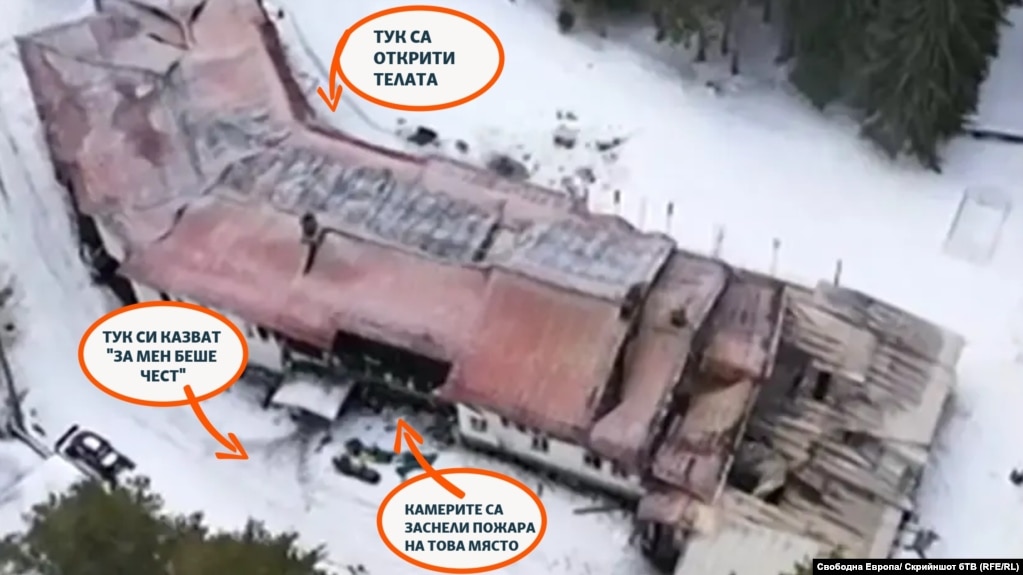 Бившата хижа "Петрохан" след пожара. Местата са означени по описанията на МВР, дадени на брифинг на 18 февруари 2026 г.